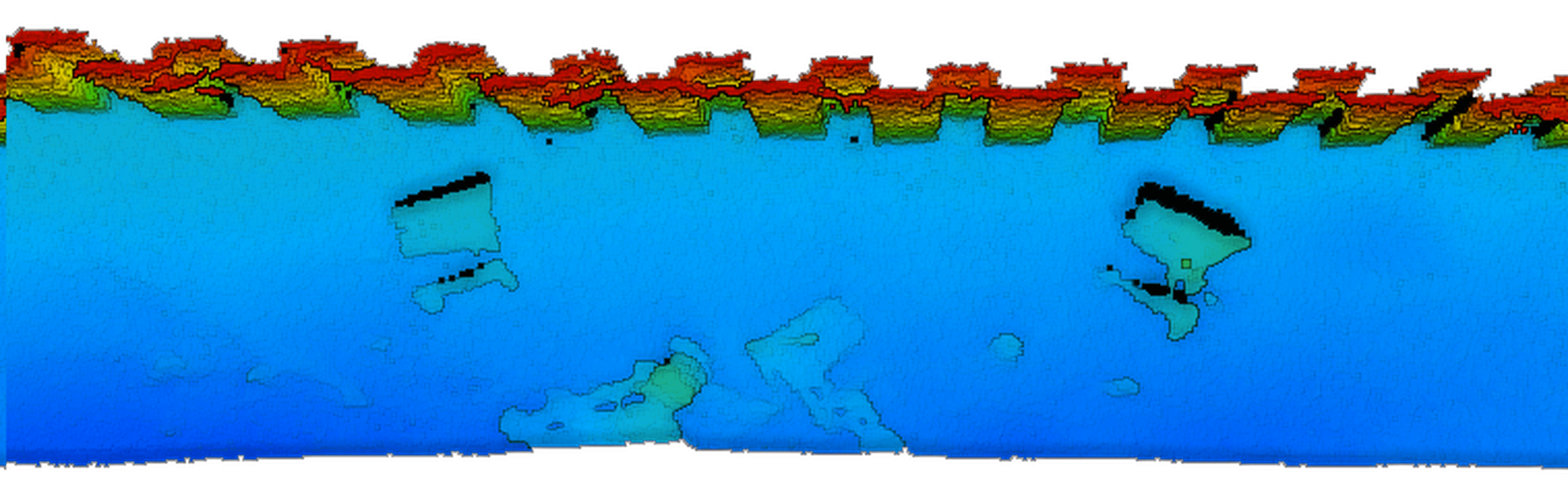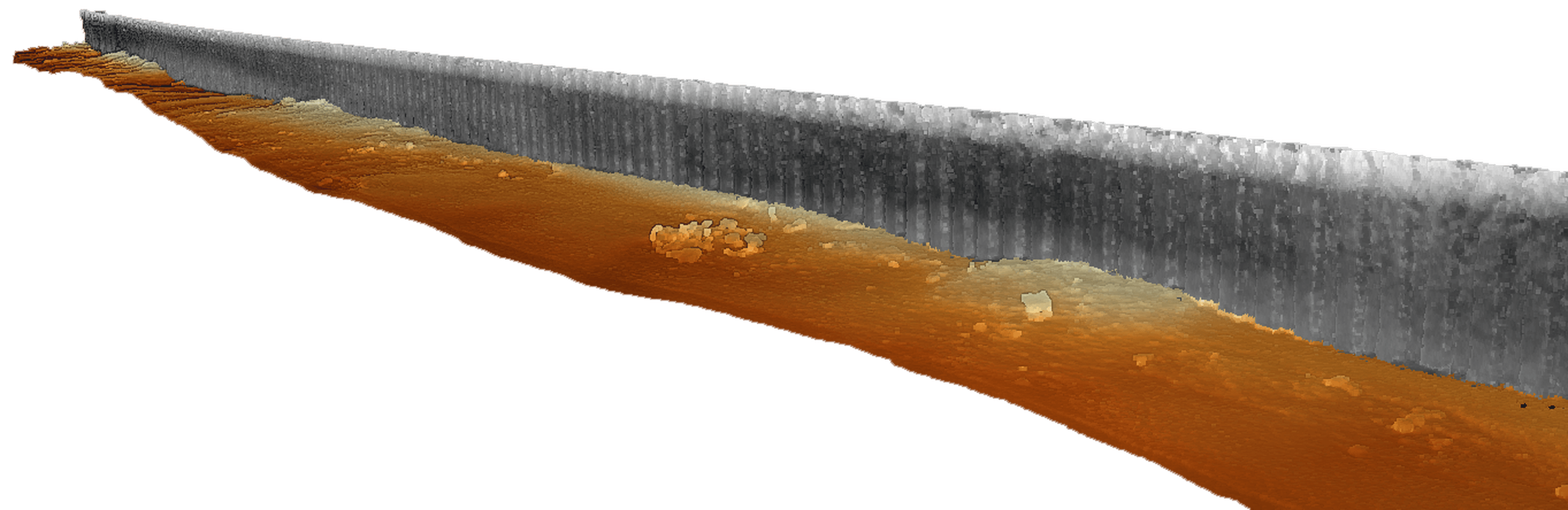 We processed the sonar data into a 3D point cloud. During processing, data from the canal bed and sheet pile walls were separated to apply specific visualization effects to each. This approach clearly highlighted both horizontal structures on the bottom and vertical details of the wall. Our processors visualized the depth information using color gradients. This made subtle structural differences and anomalies in both the wall and the canal floor more visible. For various sheet pile sections, the visualization of the bottom of the canal and the sheet pile was supplemented with the data from the drone photogrammetry.